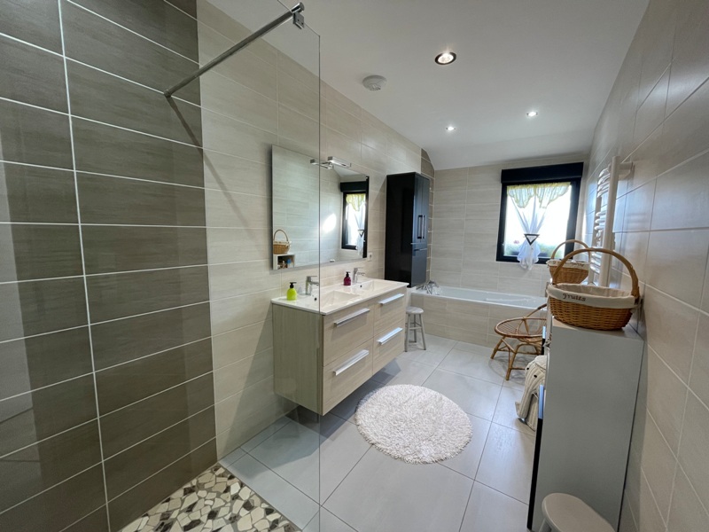Appartement comprenant un hall d'entrée avec dressing, 3 chambres dont 2 avec accès terrasses, salle de bain (baignoire, douche à l'italienne et double vasque), WC avec lave mains, cellier, cuisine équipée, avec accès 1ère terrasse est, ouverte sur salon / séjour avec accès grande terrasse principale sud-ouest.