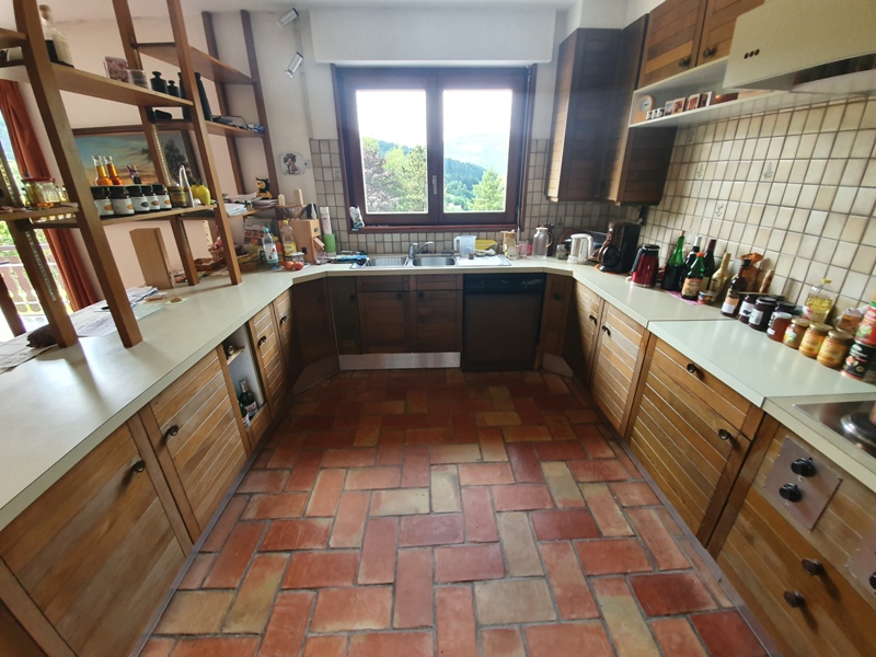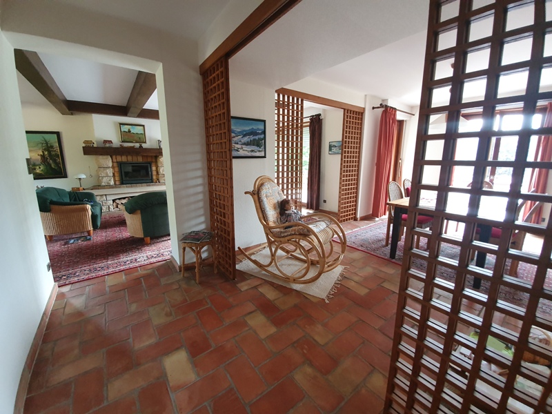 RDC : entrée avec dégagement et poêle à bois, cuisine ouverte sur grand salon / séjour avec cheminée et accès terrasse, WC séparés, 5 chambres dont 1 avec balcon, 2 salles de bain.