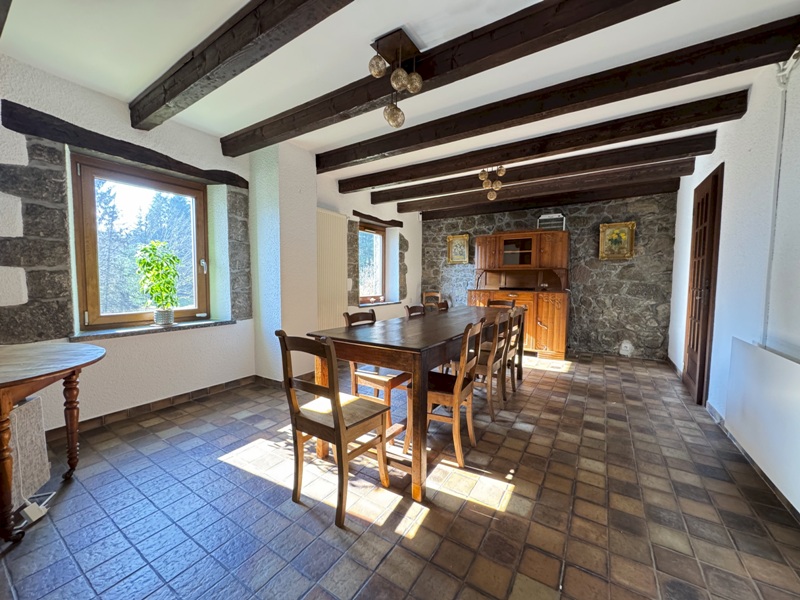 Ferme comprenant au RDC : entrée avec dégagement, salon avec cheminée insert et mezzanine, salle à manger avec accès à la cave voûtée, séjour, cuisine équipée avec poêle à pellet et accès jardin, WC avec lave mains, salle d'eau (douche italienne et double vasque), chaufferie / buanderie.