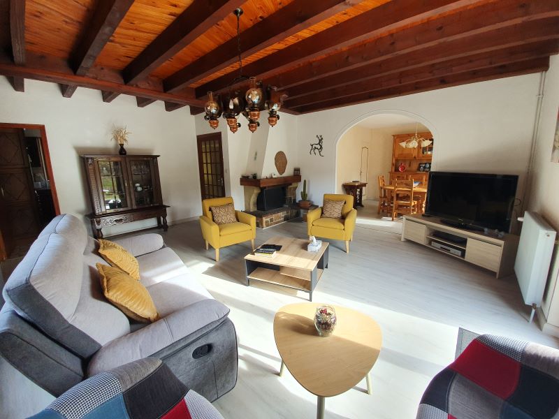 RDC : entrée avec dégagement, cuisine équipée, spacieux salon / séjour avec cheminée insert et accès terrasse plein sud, salle de bain (double vasque et baignoire), WC séparés, 2 chambres.